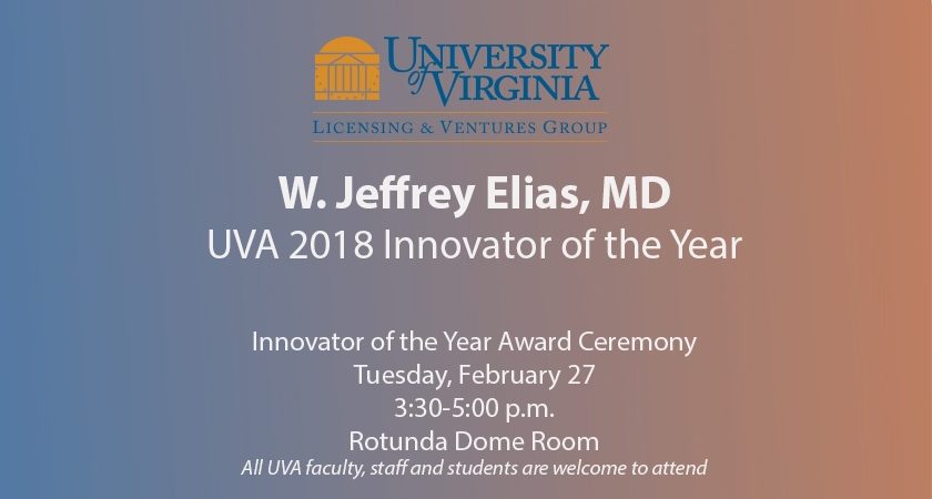 “We are pleased to honor Dr. Jeff Elias as the 2018 Innovator of the Year. His understanding of focused ultrasound technology and its adaptation for the treatment of essential tremor have made a remarkable impact not only for his patients but on the field of neurosurgery,” said Michael Straightiff, Executive Director of LVG. “Elias is leading the way for innovative clinicians in translational research at UVA, and we are thrilled to recognize his accomplishments with this award.”